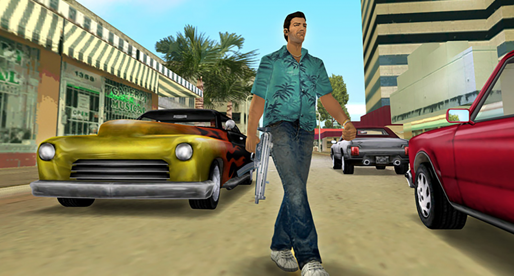Inspirado en el Miami de los años 80, Vice City apostó por una identidad visual y musical inolvidable. Neones, palmeras y una banda sonora icónica acompañan la historia de Tommy Vercetti, un protagonista con mucha más personalidad y ambición.
